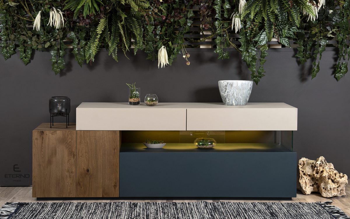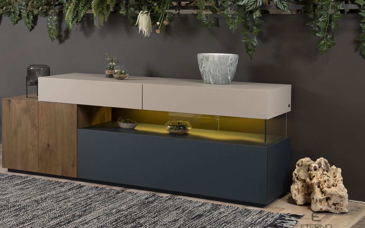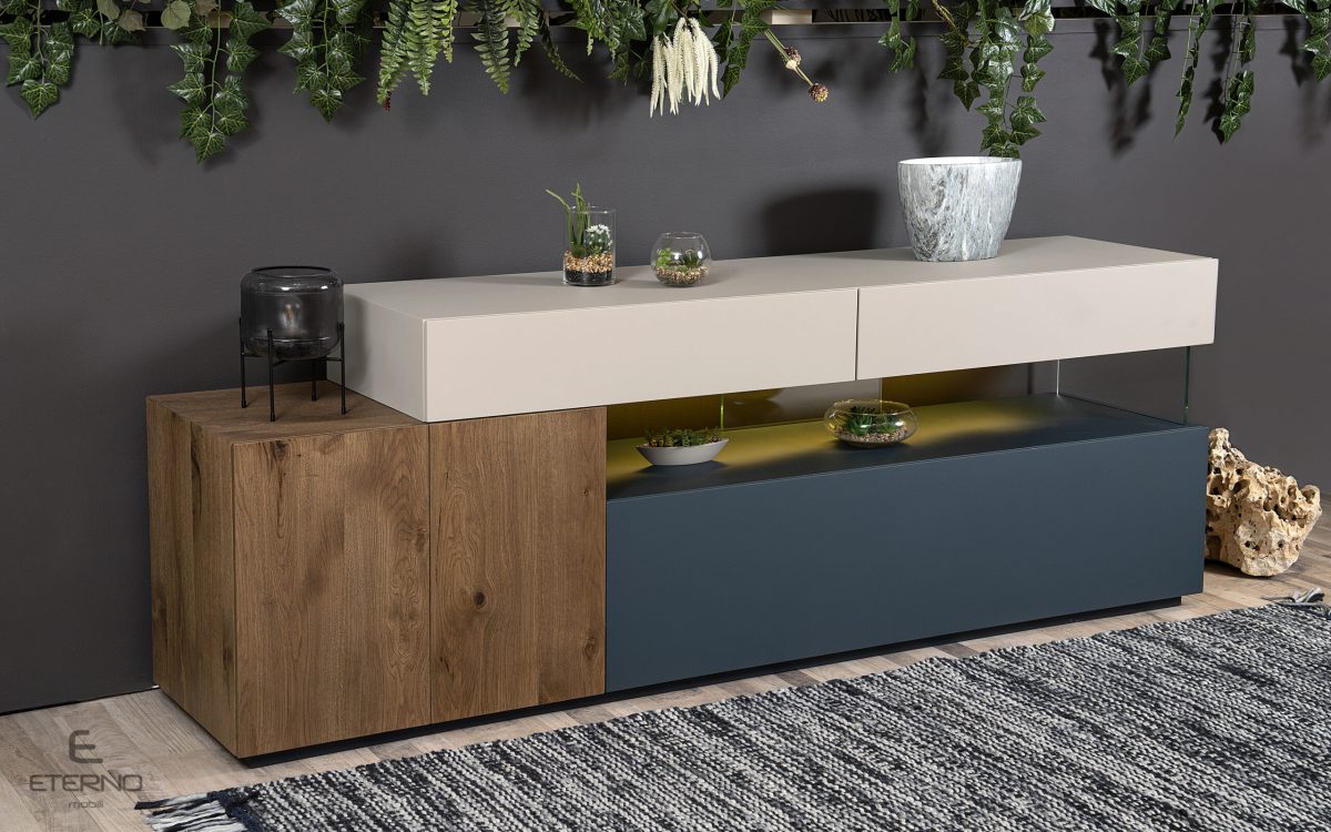 Μπουφές THINK με συνδυασμό χρωμάτων και υλικών και κρυφό, ατμοσφαιρικό φωτισμό. Διατίθεται ακριβώς στα χρώματα της φωτογράφισης και αποτελείται από 2 συρτάρια, 1 ντουλάπι κι ένα κλειστό σώμα με droop door.