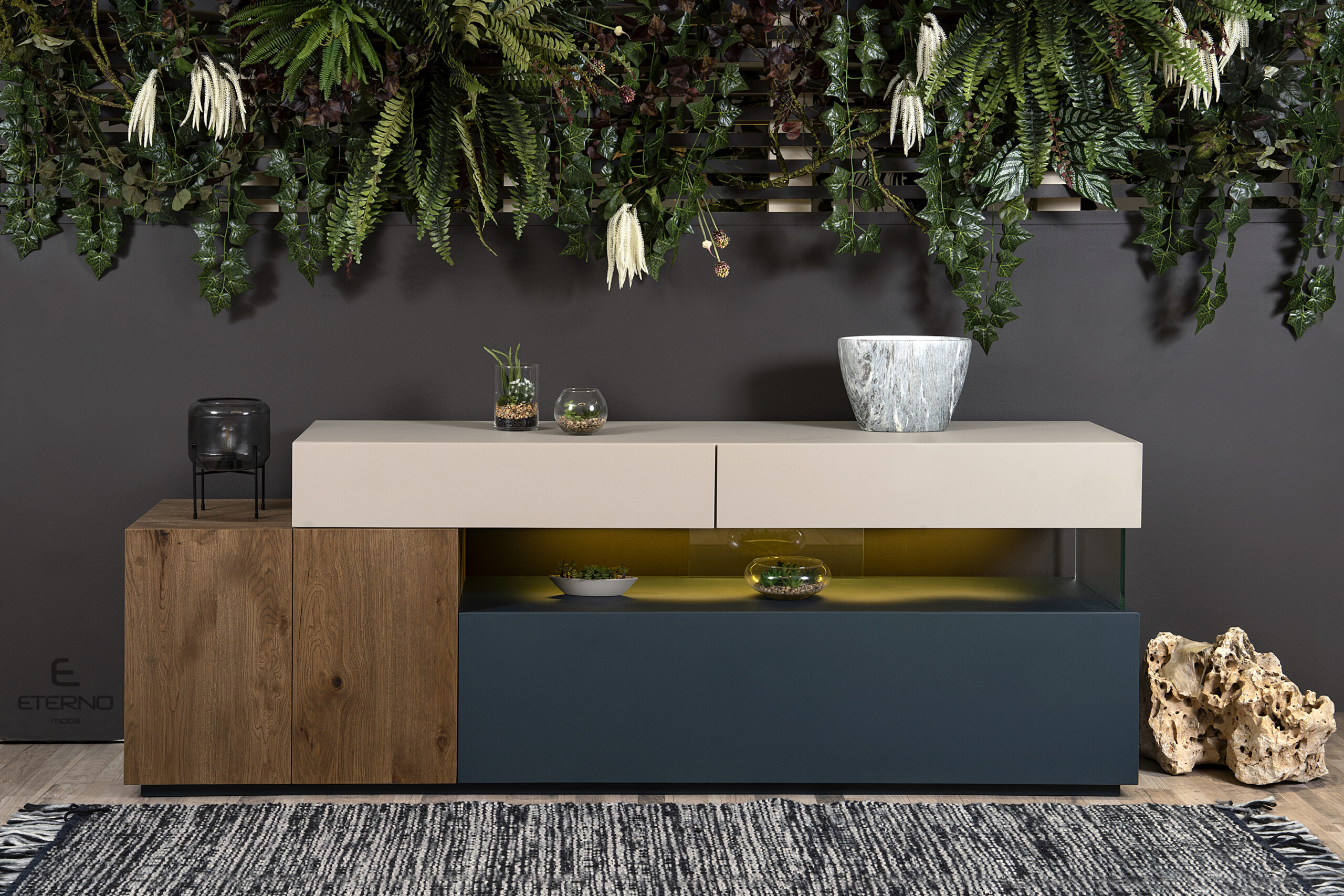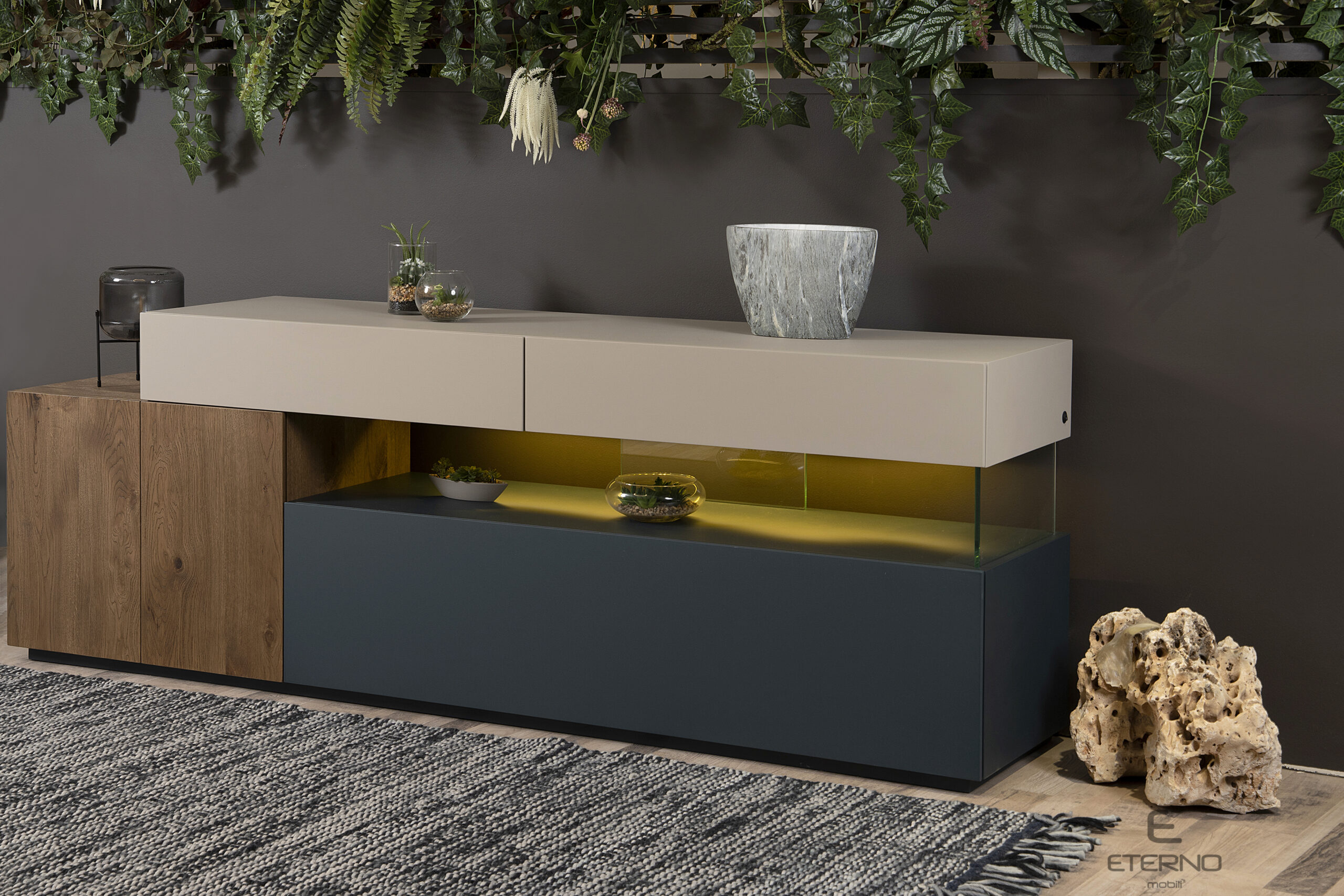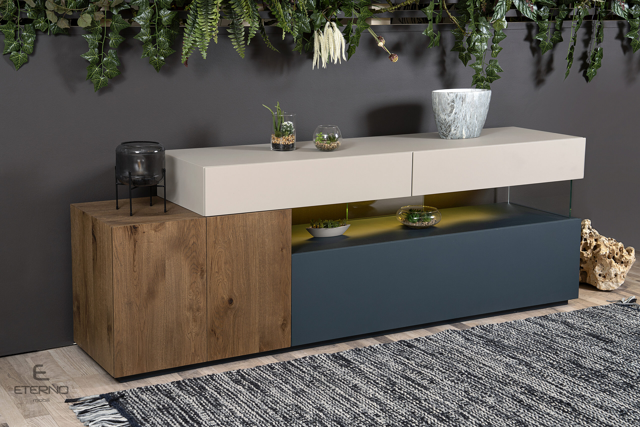 Μπουφές THINK με συνδυασμό χρωμάτων και υλικών και κρυφό, ατμοσφαιρικό φωτισμό. Διατίθεται ακριβώς στα χρώματα της φωτογράφισης και αποτελείται από 2 συρτάρια, 1 ντουλάπι κι ένα κλειστό σώμα με droop door.